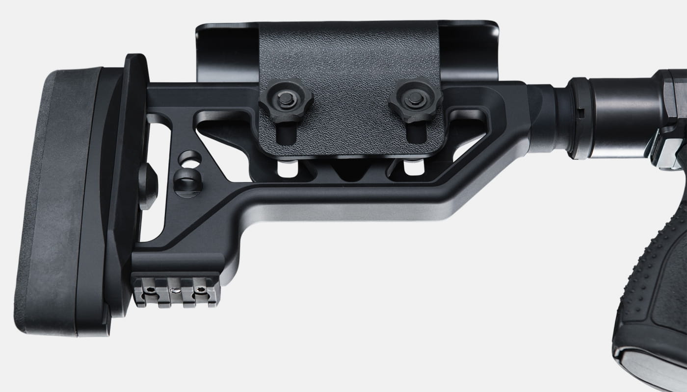 Broń może być dostosowywana do różnych kolb, osad i dodatkowego wyposażenia. Choć wyposażenie standardowe jest na bardzo dobrym poziomie: składana kolba ma szerokie możliwości regulacji.