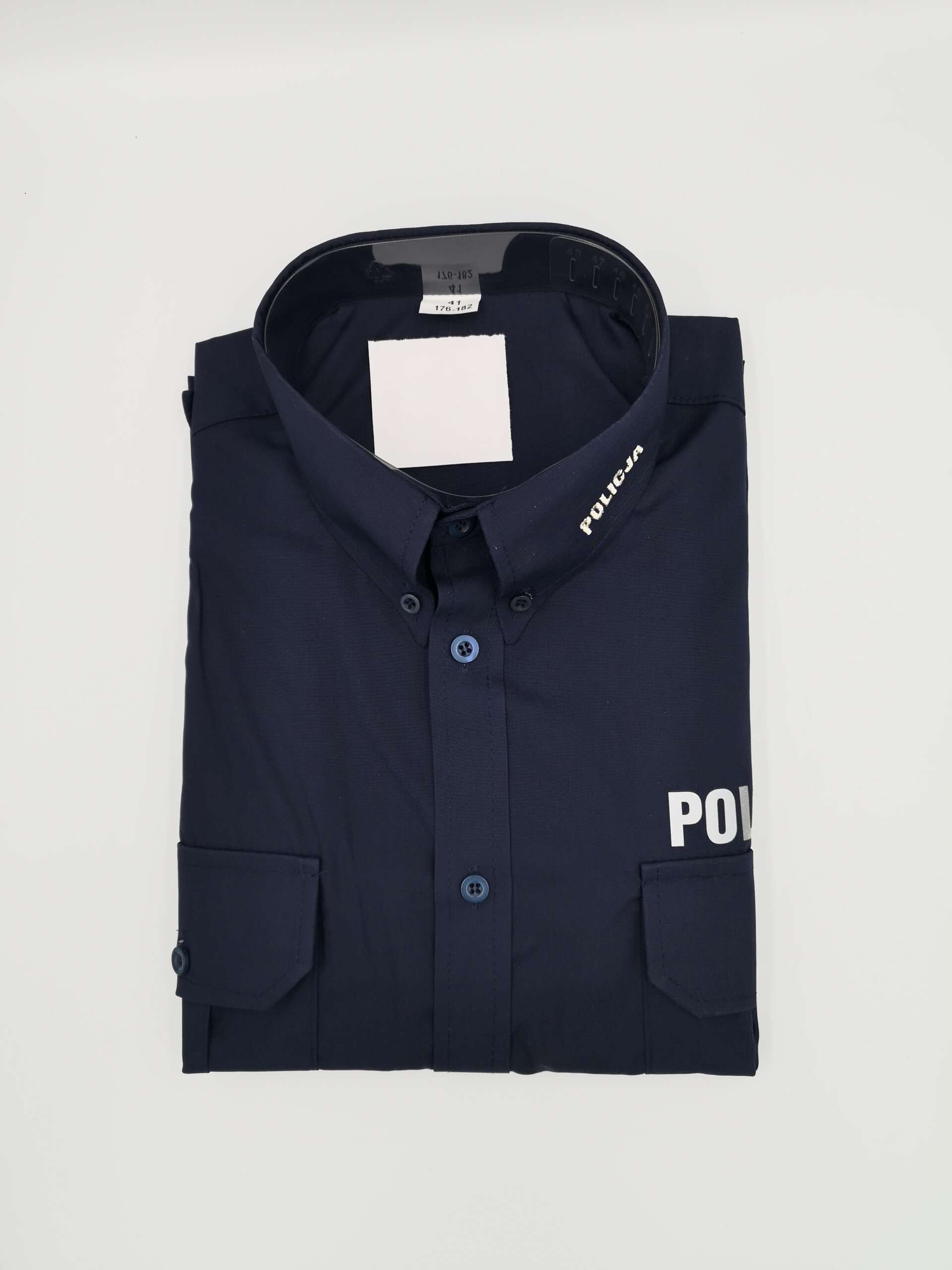 Koszula policyjna służbowa w kolorze ciemnogranatowym z krótkim rękawem. Nad lewą kieszenią oraz na rękawach srebrny, odblaskowy napis POLICJA.