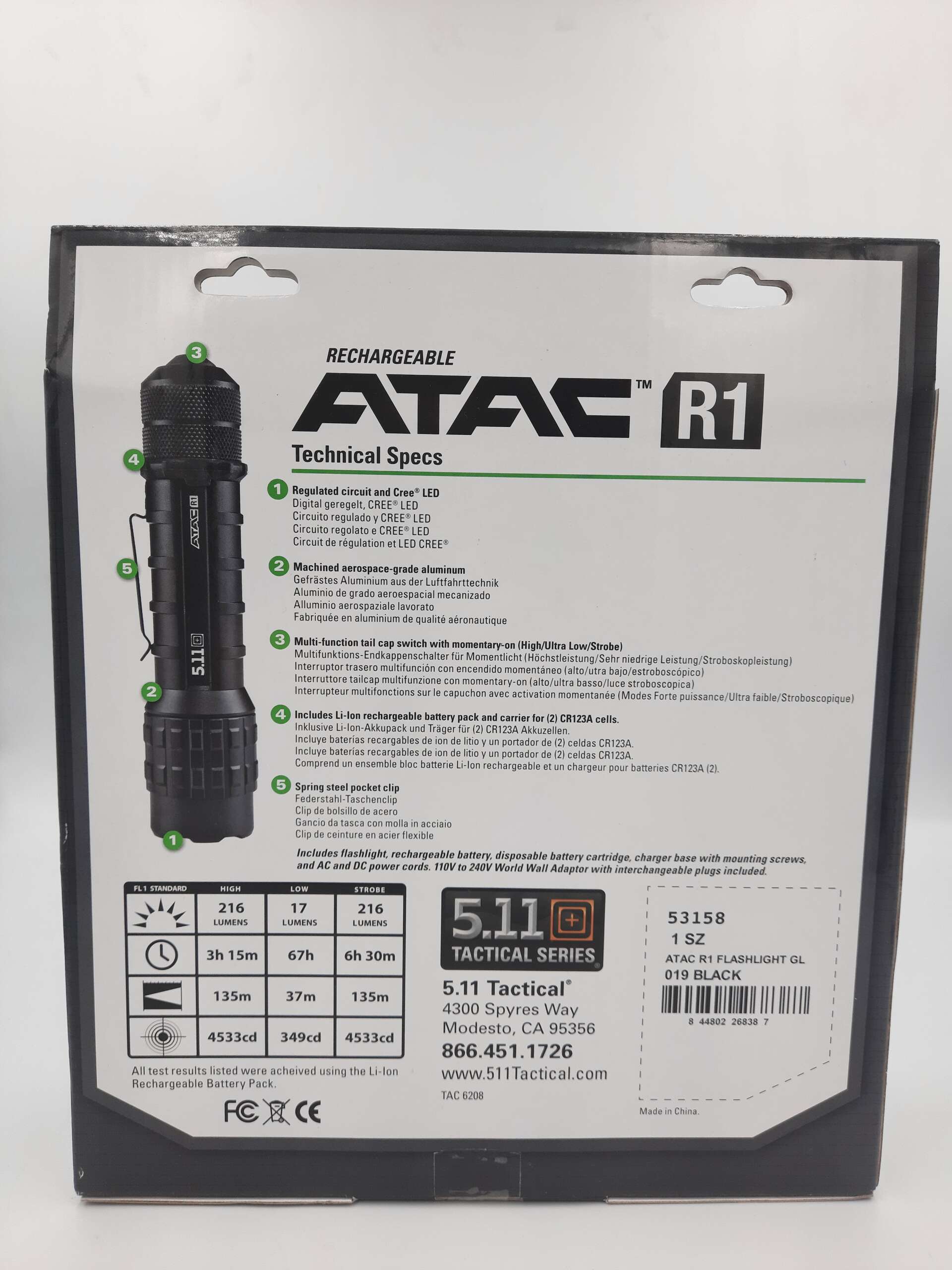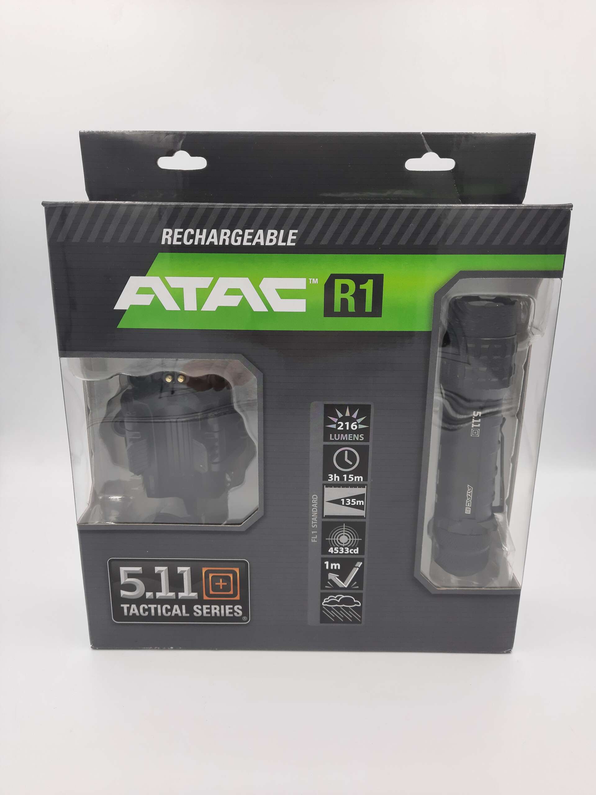 Latarka taktyczna 5.11 ATAC R1 jest wykonana z aluminium lotniczego i ma wytłoczony metalowy klips do kieszeni.